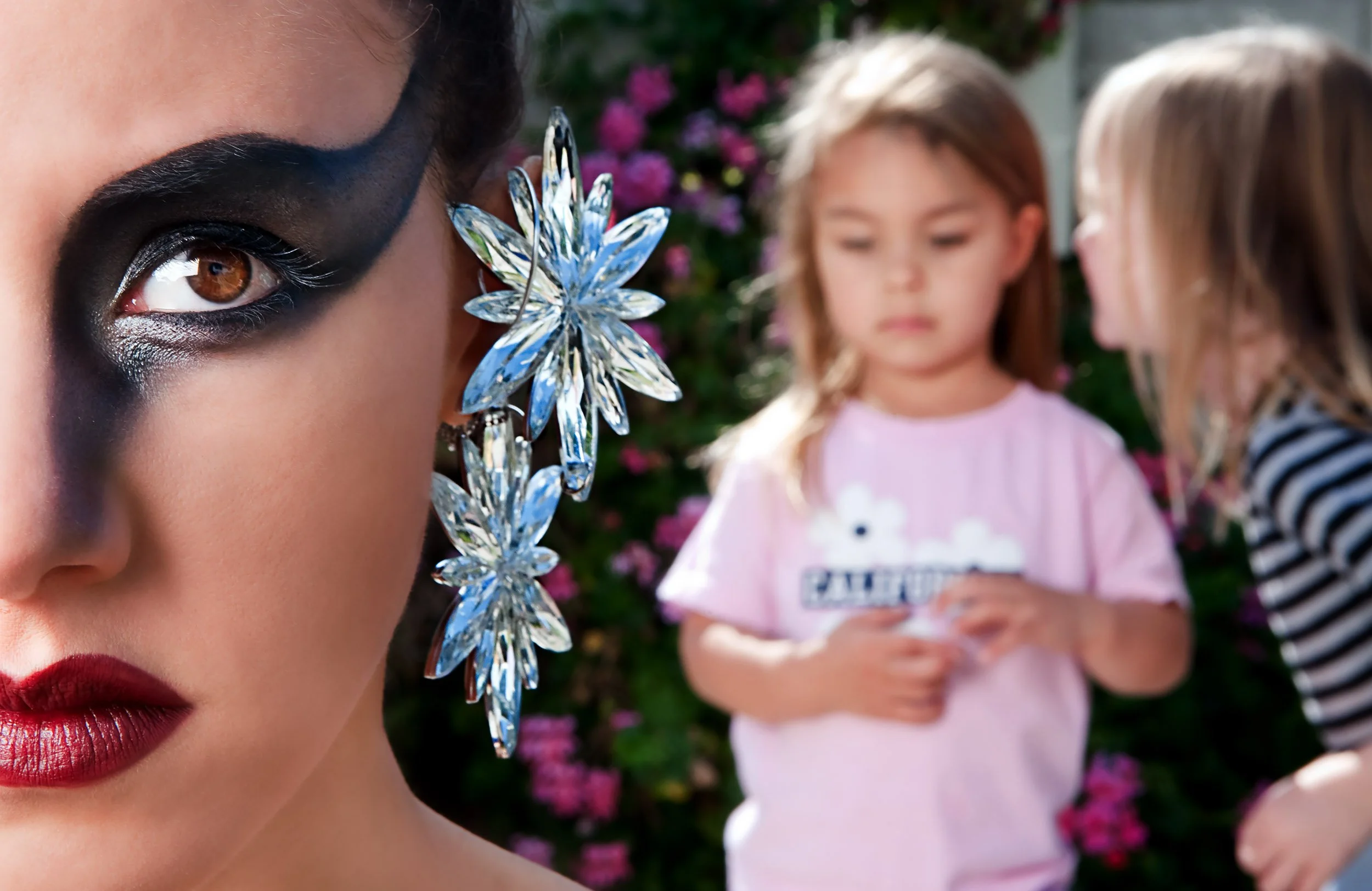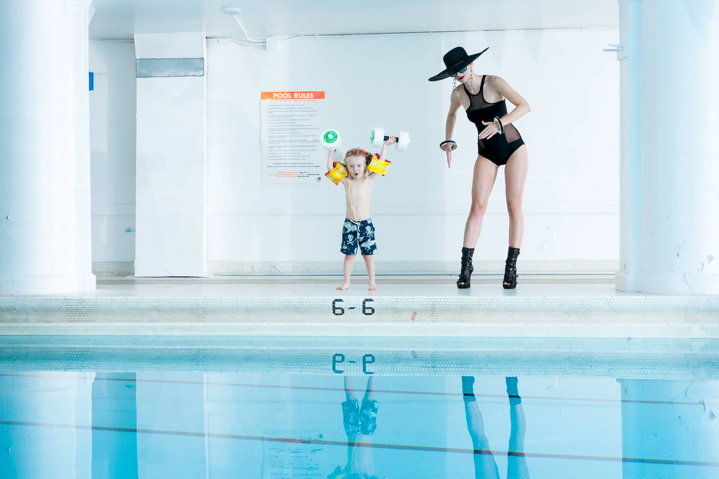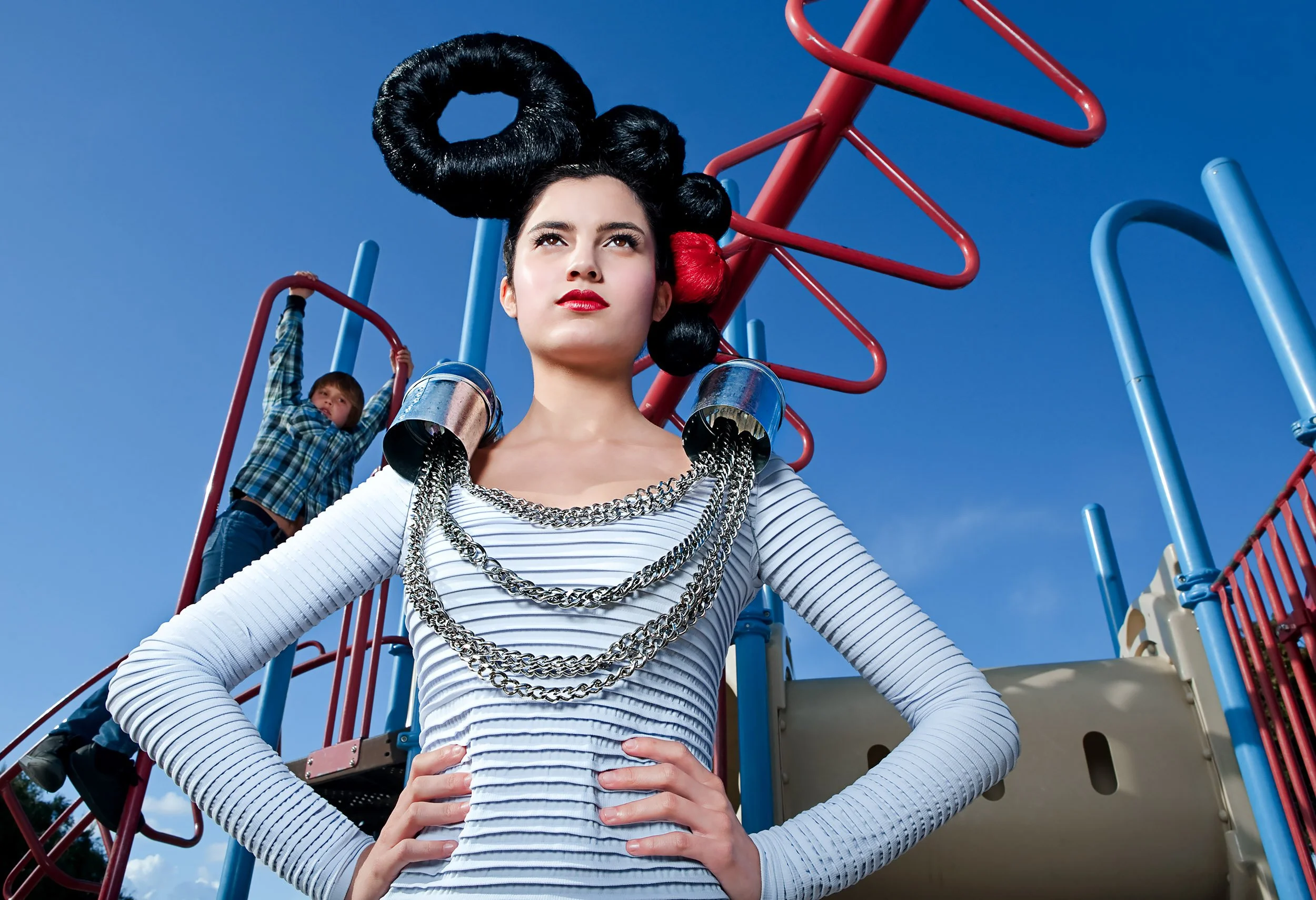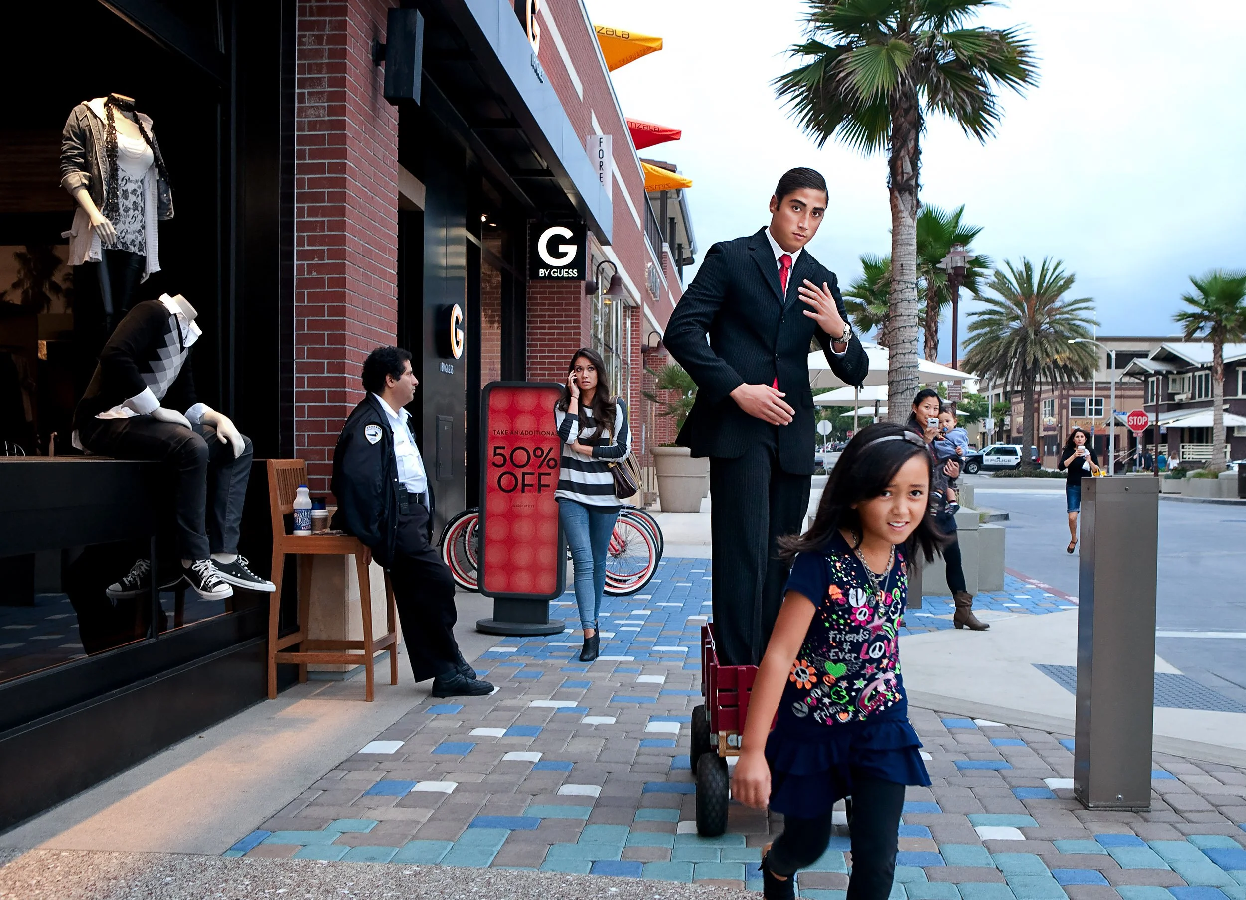 Keep in mind for context, the word “mannequin” can easily be a living model, or the plastic-like statues found in the windows displays.  After chewing on the idea a bit, I set out to create a fashion series telling a tale of models and their children-friends.  “Play Date” conveys a strong sense of design using shapes, linear perspective, implied and psychic lines.  The primary importance of the imagery is art for commerce, meaning calling attention to Fashion, through the use of use of contrast, by inserting uncommon clothes in everyday environments.  Through composition, light and styling, my goal was to either make the fashion contrast or relate to the surrounding environment.  As the project and I evolved, I started to incorporate my own subtle commentaries on various social, interpersonal and/or psychological topics.  All photos were created between 2009-2011.